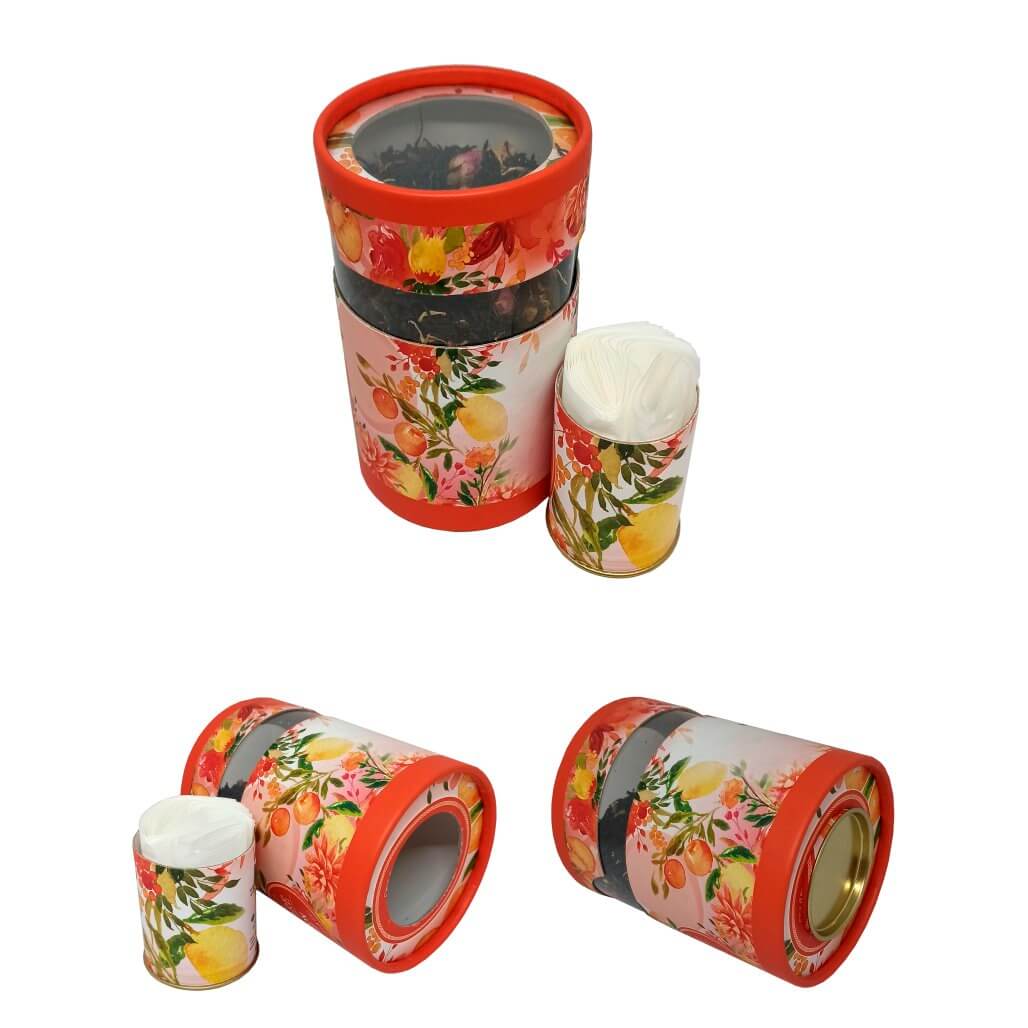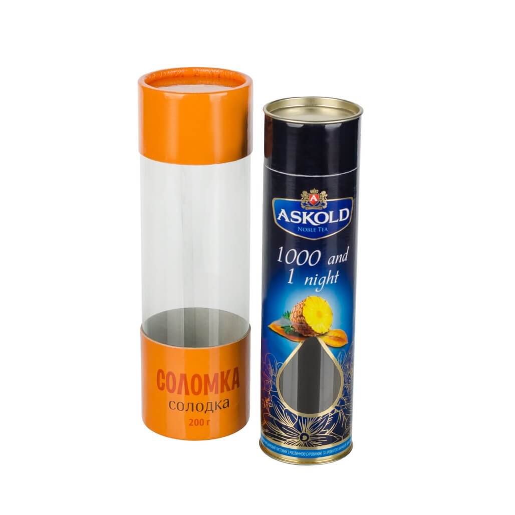 Transparent tubes may have additional decor. The lids may be made from cardboard, tin or combined (cardboard + tin or cardboard + transparent insert).